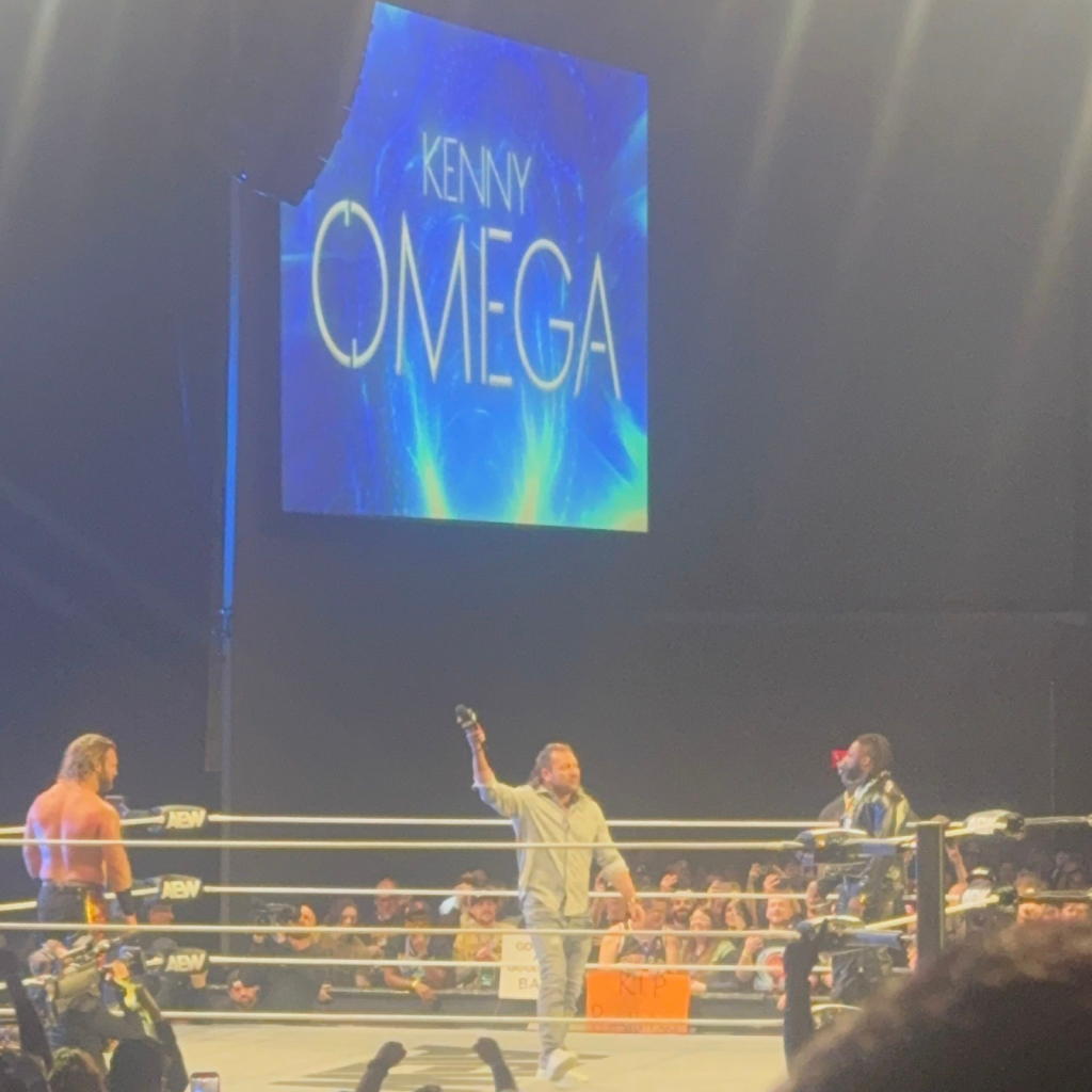 “Hangman” Adam Page and Swerve Strickland look on Kenny Omega center in the ring (Photo by Lance Reece)
